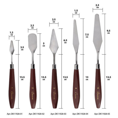Мастихин "Сонет" – тонкая стальная пластина с удобной деревянной ручкой, покрытой лаком. В наборе 5 мастихинов разных размеров.