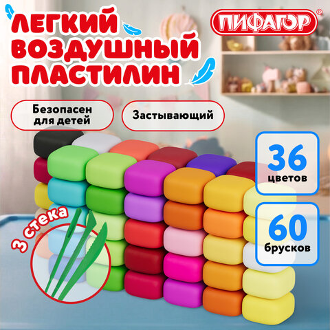 Данный набор включает в себя легкий пластилин высокого качества и три стека, которые помогают легко работать с кусочками пластилина и создавать даже миниатюрные поделки. 60 разноцветных брусков пластилина позволят ребенку создать многоцветную поделку, картину или скульптуру.