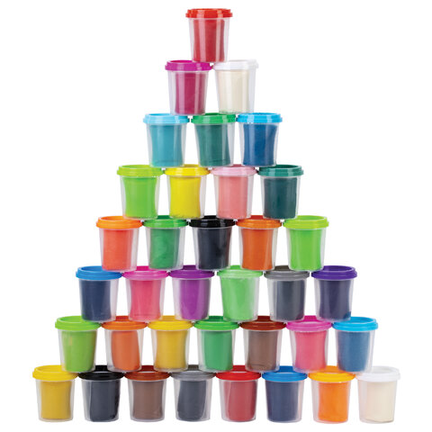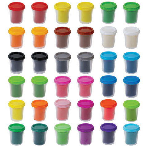 В набор входят 36 баночек теста для лепки и, 24 ярких цвета (базовых цветов по 2 шт): красный (2 шт.), желтый (2 шт.), зеленый (2 шт.), оранжевый (2 шт.), коричневый (2 шт.), белый (2 шт.), черный (2 шт.), серый (2 шт.), светло-синий (2 шт.), розовый (2 шт.), синий (2 шт.), травянисто-зеленый (2 шт.), неоновый оранжевый, неоновый красный, светло-розовый, фиолетовый, сиреневый, мятный, ярко-розовый, светло-желтый, голубой, морской зеленый, изумрудный зеленый, светло-зеленый.