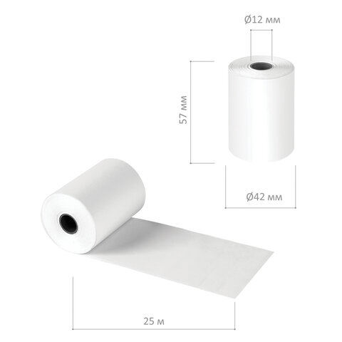 Чековая лента с наружным термослоем имеет ширину 57 мм и общую длину 25 м. Диаметр рулона – 42 мм, диаметр втулки - 12 мм. Плотность бумаги чековой ленты – 48 г/м2. Поставляется в коробе по 50 штук в комплекте. Внутри короба рулоны упакованы в термоусадочную пленку по 10 шт.