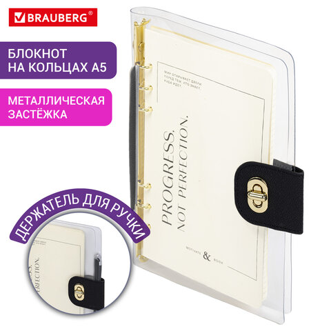 Снабжен застежкой с поворотным механизмом, благодаря чему блокнот не откроется в сумочке или портфеле, и листы не помнутся. Формат А5 (180х235 мм) позволит владельцу поместить его в кейс или сумку малых габаритов.
