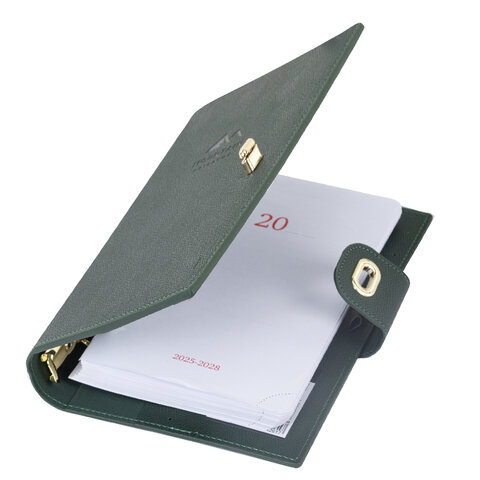 Тип ежедневника: недатированный Формат: В5 Обложка: под кожу Вид обложки: твердая Количество листов: 160 шт. Особенности: перфорация уголков, скругленные углы, справочная информация, фиксатор для ручки Серия: Nova Тип застежки: ремешок и застёжка Основной цвет обложки: зеленый Дополнительный цвет обложки: нет Цвет среза: нет Цвет внутреннего блока: белый Плотность внутреннего блока: 70 г/м2 Высота строки для записи: 5 мм Тип крепления: кольцевой механизм Печать блока: 2 краски Подходит для блинтового тиснения: да Подходит для тиснения фольгой: да Длина: 240 мм Ширина: 167 мм Толщина: 25 мм
