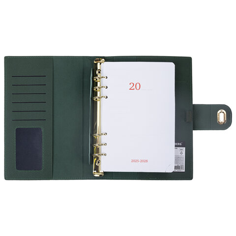 Твердая обложка с кольцевым механизмом оснащена дополнительными карманами для хранения бумаг, карточек и мелочей. Съемный внутренний блок включает 160 листов белой бумаги плотностью 70 г/м2. Благодаря формату B5 (167х240 мм) ежедневник удобно использовать как в офисе, так и на выездных деловых встречах.