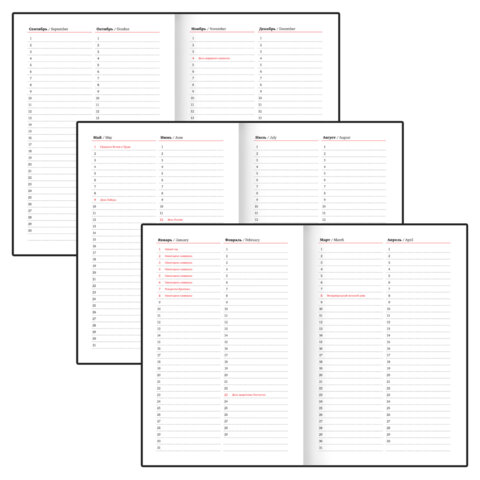 Гибкая съемная обложка стилизована под текстурную кожу. Материал обложки подходит для горячего тиснения. Дополнениями являются закладка-ляссе, с помощью которой при необходимости можно быстро открыть ежедневник на нужной странице, и держатель для ручки. На обложке расположены несколько карманов для карт, визиток или купюр. Справочный материал дополнительно расширяет функциональность ежедневника. В конце внутреннего блока есть 7 страниц для записей и заметок.