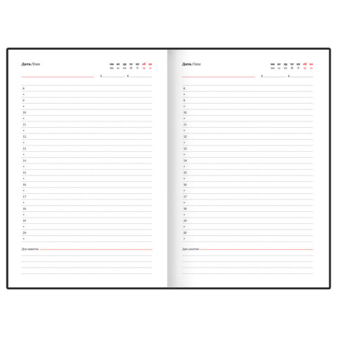 Внутренний блок включает 160 листов белой бумаги плотностью 70 г/м2. Каждая страничка имеет перфорированный угол. Благодаря компактному формату B6 (130х185 мм) ежедневник удобно использовать как в офисе, так и на выездных деловых встречах.
