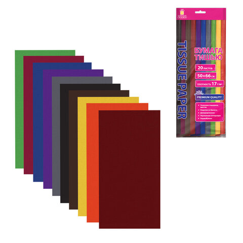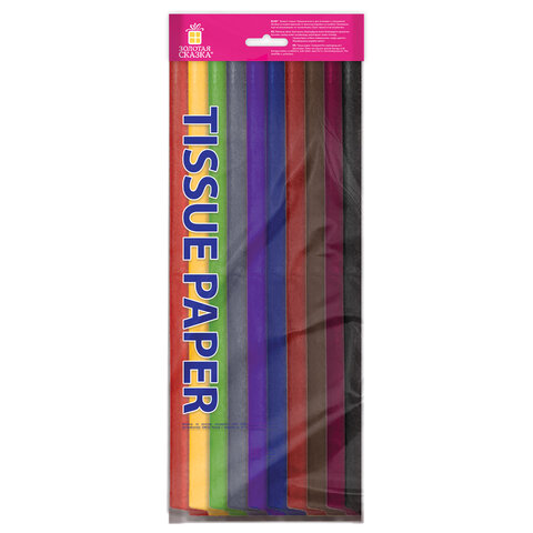 Тип бумаги: двусторонняя, матовая Внутренний блок: офсет Формат: 50х66 см Количество листов: 20 Цвет: ассорти Количество цветов: 10 Тип товара: бумага тишью Плотность бумаги: 17 г/м2 Прокрас бумаги: с 2 сторон Ширина: 500 мм Длина: 660 мм Индивидуальная упаковка: да Упаковка: пакет с европодвесом