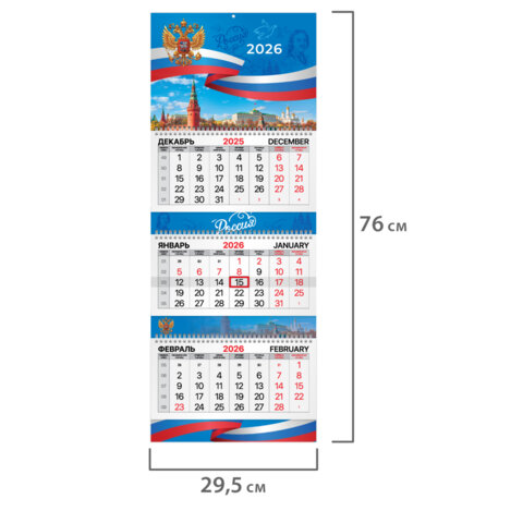 Тип календаря: квартальный на 3 гребнях Год: 2026 Тип скрепления: гребень Размер: 29,5х76 см Внутренний блок: мелованная бумага Плотность внутреннего блока: 80 г/м2 Подложка: мелованный картон Плотность подложки: 250 г/м2 Курсор: да Пикколо: да Дизайн: Символика2 Календарная сетка: с разбивкой на 3 месяца Индивидуальная упаковка: да