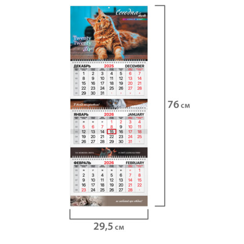 Тип календаря: квартальный на 3 гребнях Год: 2026 Тип скрепления: гребень Размер: 29,5х76 см Внутренний блок: мелованная бумага Плотность внутреннего блока: 80 г/м2 Подложка: мелованный картон Плотность подложки: 250 г/м2 Курсор: да Пикколо: да Дизайн: Котик Календарная сетка: с разбивкой на 3 месяца Индивидуальная упаковка: да