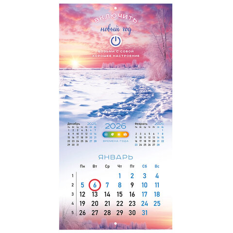 Тип календаря: настенный перекидной Год: 2026 Тип скрепления: скрепка Размер: 28,5х28,5 см Внутренний блок: мелованная бумага Плотность внутреннего блока: 130 г/м2 Подложка: нет Курсор: да Дизайн: Времена года Календарная сетка: с разбивкой на месяц Индивидуальная упаковка: да