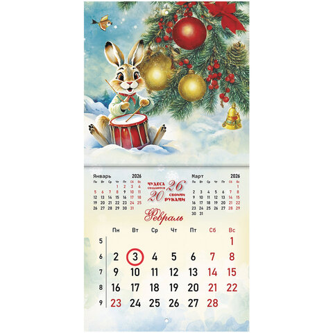 Календарь квартальный на 2026 г., 3 блока, 3 гребня, бегунок, мелованная бумага, BRAUBERG,...