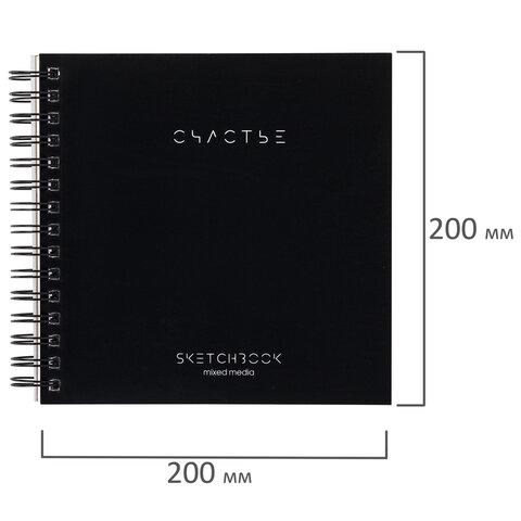 Тип товара: блокнот (скетчбук) Серия: Classic Вид работ: для зарисовок, эскизов, рисования Количество листов: 60 Формат: квадрат Ширина: 200 мм Длина: 200 мм Дизайн: "Счастье" Обложка: твердый переплет Внутренний блок: художественная бумага Цвет внутреннего блока: белый Плотность внутреннего блока: 200 г/м2 Жесткая подложка: да Тип скрепления: гребень Без кислот: да Цвет обложки: черный Индивидуальная упаковка: да