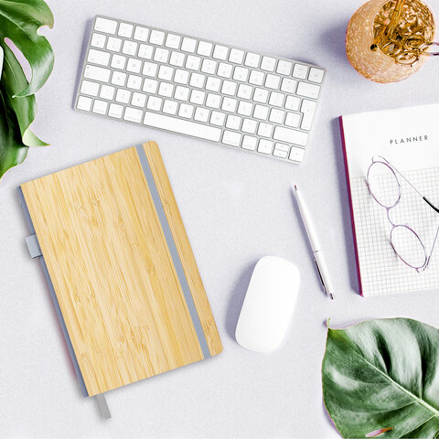 Твердая обложка изготовлена из бамбука с отделкой под кожу, что придает ежедневнику оригинальный вид. Ежедневник снабжен резинкой-фиксатором, благодаря чему он не откроется в сумочке или портфеле, и листы не помнутся.