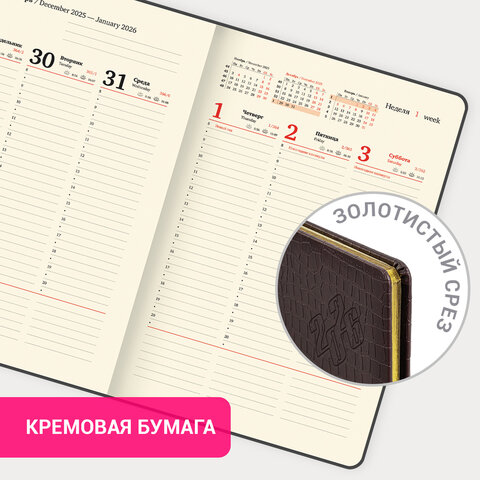 Внутренний блок включает 64 листа кремовой бумаги плотностью 70 г/м2. Благодаря большому формату А4 (210х297 мм) еженедельник удобно использовать как в офисе, так и на выездных деловых встречах. Твердая обложка коричневого цвета, стилизованная под кожу крокодила, подходит для горячего тиснения.