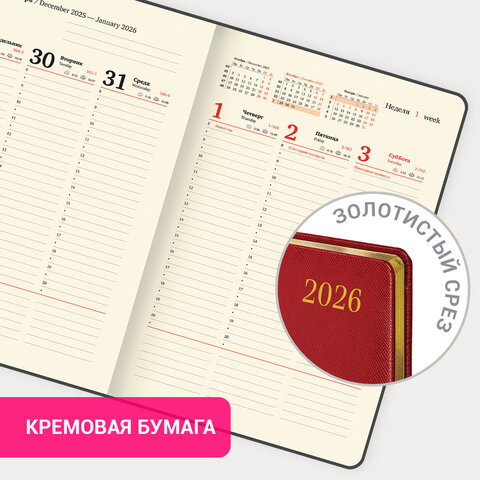 Внутренний блок включает 64 листа кремовой бумаги плотностью 70 г/м2. Благодаря большому формату А4 еженедельник удобно использовать как в офисе, так и на выездных деловых встречах. Твердая обложка, стилизованная под фактурную кожу красного цвета, подходит для горячего тиснения.