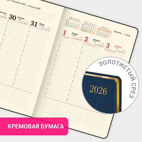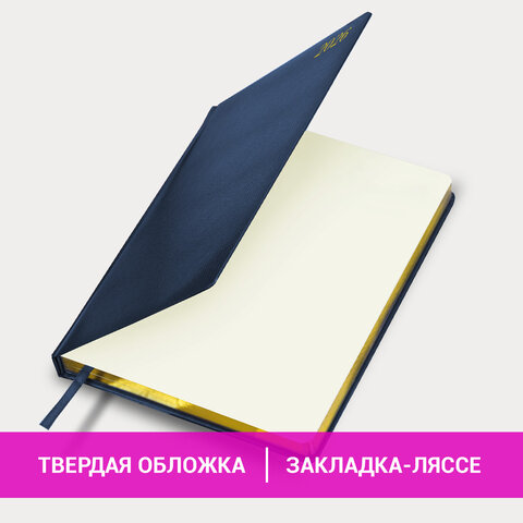 Внутренний блок включает 64 листа кремовой бумаги плотностью 70 г/м2. Благодаря большому формату А4 еженедельник удобно использовать как в офисе, так и на выездных деловых встречах. Твердая обложка, стилизованная под фактурную кожу благородного синего цвета, подходит для горячего тиснения.