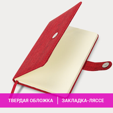 Внутренний блок включает 64 листа тонированной бумаги плотностью 70 г/м2. Благодаря стандартному формату А5 (145х215 мм) еженедельник удобно использовать как в офисе, так и на выездных деловых встречах. Твердая обложка, стилизованная под кожу с текстурной выработкой, фиксируется магнитной застежкой, поэтому еженедельник не откроется в сумке или портфеле и страницы не помнутся. Подходит для горячего тиснения. Еженедельник выполнен в красном цвете.