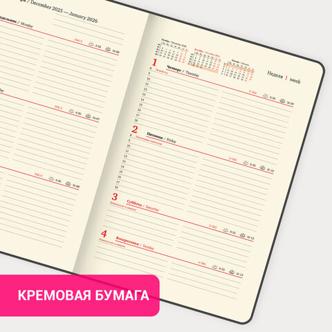 Дополнением является закладка-ляссе, с помощью которой при необходимости можно быстро открыть еженедельник на нужной странице. Для заметок в еженедельнике есть 7 страниц в конце внутреннего блока. Помимо прочего, еженедельник снабжен обширным справочным материалом.