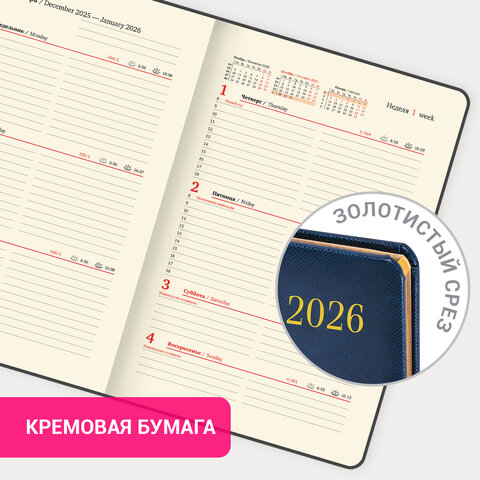 Срез еженедельника украшен золотым фольгированием – это подчеркивает премиальность изделия. Дополнением является закладка-ляссе, с помощью которой при необходимости можно быстро открыть еженедельник на нужной странице. В конце внутреннего блока есть 7 страниц для записей и заметок. Обширный справочный материал расширяет функциональность еженедельника.