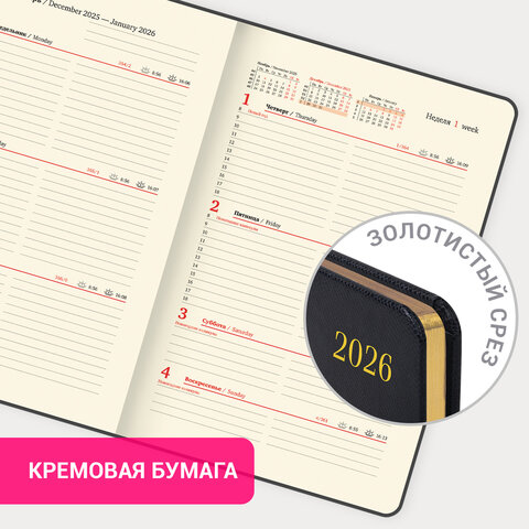 Срез еженедельника украшен золотым фольгированием – это подчеркивает премиальность изделия. Дополнением является закладка-ляссе, с помощью которой при необходимости можно быстро открыть еженедельник на нужной странице. В конце внутреннего блока есть 7 страниц для записей и заметок. Обширный справочный материал расширяет функциональность еженедельника.