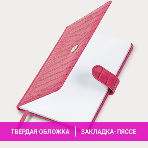 Внутренний блок включает 64 листа белой бумаги плотностью 70 г/м2. Благодаря стандартному формату А5 (145х215 мм) еженедельник удобно использовать как в офисе, так и на выездных деловых встречах. Твердая обложка розового цвета, стилизованная под кожу крокодила, фиксируется магнитной застежкой, поэтому еженедельник не откроется в сумке или портфеле и страницы не помнутся. Подходит для горячего тиснения.