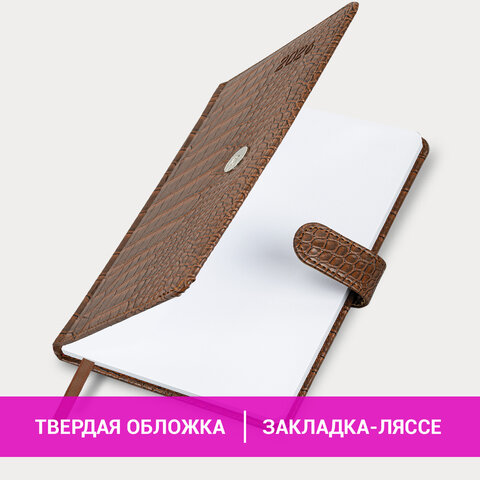 Внутренний блок включает 64 листа белой бумаги плотностью 70 г/м2. Благодаря стандартному формату А5 (145х215 мм) еженедельник удобно использовать как в офисе, так и на выездных деловых встречах. Твердая обложка коричневого цвета, стилизованная под кожу крокодила, фиксируется магнитной застежкой, поэтому еженедельник не откроется в сумке или портфеле и страницы не помнутся. Подходит для горячего тиснения.