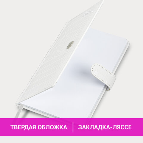 Внутренний блок включает 64 листа белой бумаги плотностью 70 г/м2. Благодаря стандартному формату А5 (145х215 мм) еженедельник удобно использовать как в офисе, так и на выездных деловых встречах. Твердая обложка белого цвета, стилизованная под кожу крокодила, фиксируется магнитной застежкой, поэтому еженедельник не откроется в сумке или портфеле и страницы не помнутся. Подходит для горячего тиснения.