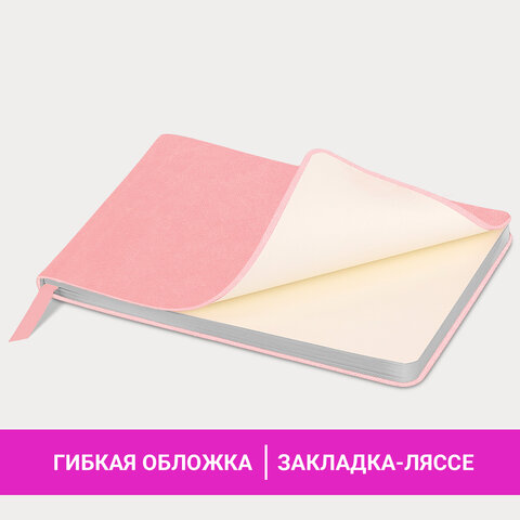 Внутренний блок включает 64 листа белой бумаги плотностью 70 г/м2. Благодаря малому формату А6 (105х160 мм) еженедельник удобно использовать как в офисе, так и на выездных деловых встречах. Гибкая обложка розового цвета, стилизованная под фактурную кожу с блеском, подходит для горячего тиснения.