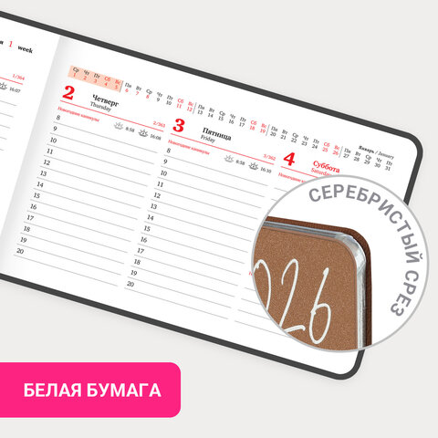 Тип еженедельника: датированный Серия: Blaze Год: 2026 Формат: А6 Обложка: под фактурную кожу Количество листов: 64 шт. Особенности: закладка-ляссе, скругленные углы, справочная информация Тип застежки: нет Основной цвет обложки: коричневый Дополнительный цвет обложки: нет Цветной срез: да Цвет внутреннего блока: белый Плотность внутренного блока: 70 г/м2 Тип крепления: сшивка Печать блока: 2 краски Подходит для блинтового тиснения: да Подходит для тиснения фольгой: да Длина: 160 мм Ширина: 105 мм
