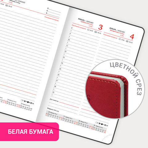 Твердая обложка яркого красного цвета стилизована под гладкую кожу. Подходит для горячего тиснения. Срез и форзац ежедневника окрашены на контрасте с цветом обложки, что придает ему особый шарм.