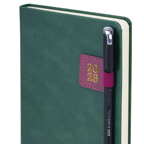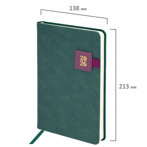 Тип ежедневника: датированный Формат: А5 Обложка: под текстурную кожу Вид обложки: твердая Количество листов: 168 шт. Особенности: закладка-ляссе, перфорация уголков, скругленные углы, справочная информация, фиксатор для ручки Серия: Accent Год: 2026 Тип застежки: нет Основной цвет обложки: зеленый Дополнительный цвет обложки: бордовый Цвет среза: нет Цвет внутреннего блока: кремовый Плотность внутреннего блока: 70 г/м2 Высота строки для записи: 4 мм Тип крепления: сшивка Печать блока: 2 краски Подходит для блинтового тиснения: да Подходит для тиснения фольгой: да Длина: 213 мм Ширина: 138 мм Толщина: 20 мм