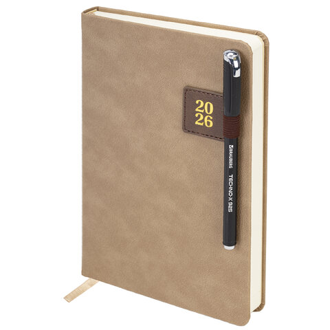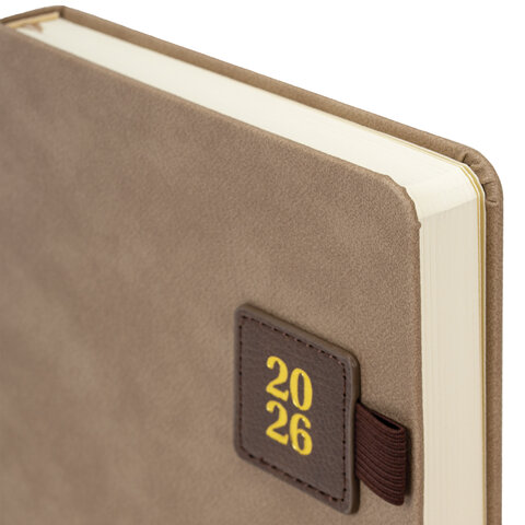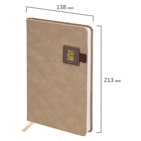 Тип ежедневника: датированный Формат: А5 Обложка: под текстурную кожу Вид обложки: твердая Количество листов: 168 шт. Особенности: закладка-ляссе, перфорация уголков, скругленные углы, справочная информация, фиксатор для ручки Серия: Accent Год: 2026 Тип застежки: нет Основной цвет обложки: бежевый Дополнительный цвет обложки: коричневый Цвет среза: нет Цвет внутреннего блока: кремовый Плотность внутреннего блока: 70 г/м2 Высота строки для записи: 4 мм Тип крепления: сшивка Печать блока: 2 краски Подходит для блинтового тиснения: да Подходит для тиснения фольгой: да Длина: 213 мм Ширина: 138 мм Толщина: 20 мм