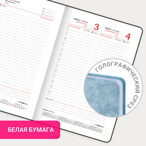 Внутренний блок включает 168 листов белой бумаги плотностью 70 г/м2. Каждая страничка имеет перфорированный угол. Благодаря стандартному формату А5 (138х213 мм) датированный ежедневник удобно использовать как в офисе, так и на выездных деловых встречах.