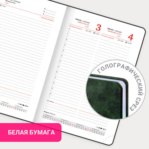 Тип ежедневника: датированный Формат: А5 Обложка: под текстурную кожу Вид обложки: твердая Количество листов: 168 шт. Особенности: закладка-ляссе, перфорация уголков, скругленные углы, справочная информация Серия: Ice Год: 2026 Тип застежки: нет Основной цвет обложки: темно-зеленый Дополнительный цвет обложки: нет Цвет среза: голографический Цвет внутреннего блока: белый Плотность внутреннего блока: 70 г/м2 Высота строки для записи: 4 мм Тип крепления: сшивка Печать блока: 2 краски Подходит для блинтового тиснения: да Подходит для тиснения фольгой: да Длина: 213 мм Ширина: 138 мм Толщина: 20 мм