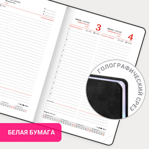Тип ежедневника: датированный Формат: А5 Обложка: под текстурную кожу Вид обложки: твердая Количество листов: 168 шт. Особенности: закладка-ляссе, перфорация уголков, скругленные углы, справочная информация Серия: Ice Год: 2026 Тип застежки: нет Основной цвет обложки: черный Дополнительный цвет обложки: нет Цвет среза: голографический Цвет внутреннего блока: белый Плотность внутреннего блока: 70 г/м2 Высота строки для записи: 4 мм Тип крепления: сшивка Печать блока: 2 краски Подходит для блинтового тиснения: да Подходит для тиснения фольгой: да Длина: 213 мм Ширина: 138 мм Толщина: 20 мм