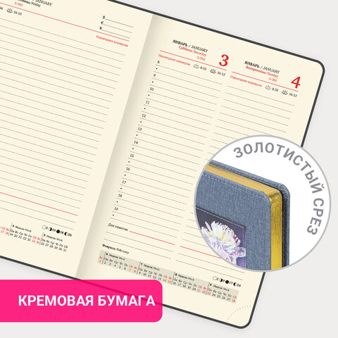 Внутренний блок включает 168 листов кремовой бумаги плотностью 70 г/м2. Каждая страничка имеет перфорированный угол. Благодаря стандартному формату А5 (138х213 мм) датированный ежедневник удобно использовать как в офисе, так и на выездных деловых встречах.