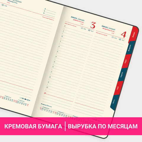 Внутренний блок включает 168 листов кремовой бумаги плотностью 70 г/м2. Каждая страничка имеет перфорированный угол. Благодаря небольшому формату B6 (125х173 мм) ежедневник удобно использовать как в офисе, так и на выездных деловых встречах. Твердая обложка стилизована под текстурную кожу. Материал обложки подходит для горячего тиснения.