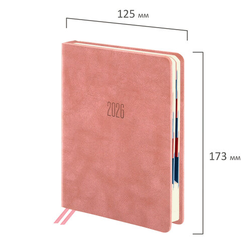 Тип ежедневника: датированный Формат: В6 Обложка: под фактурную кожу Вид обложки: твердая Количество листов: 168 шт. Особенности: вырубка блока, закладка-ляссе, перфорация уголков, скругленные углы, справочная информация Серия: Vivid Год: 2026 Тип застежки: нет Основной цвет обложки: розовый Дополнительный цвет обложки: нет Цвет среза: нет Цвет внутреннего блока: кремовый Плотность внутреннего блока: 70 г/м2 Высота строки для записи: 4 мм Тип крепления: сшивка Печать блока: 2 краски Подходит для блинтового тиснения: да Подходит для тиснения фольгой: да Длина: 173 мм Ширина: 125 мм Толщина: 20 мм