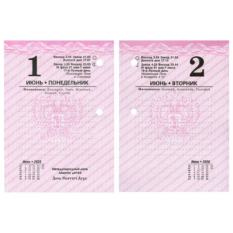 Блок календаря на 2026 год напечатан на офсетной бумаге плотностью 60 г/м2 в две краски с выделением цветом выходных и праздничных дней. Справочная информация на 160 листах: календарь на текущий месяц, часы восхода и захода солнца, долгота дня, лунный календарь, праздники.