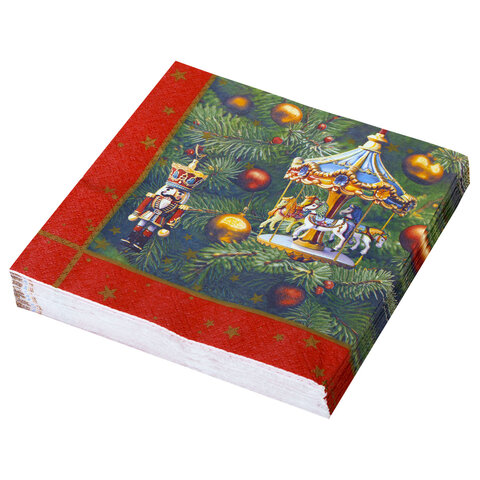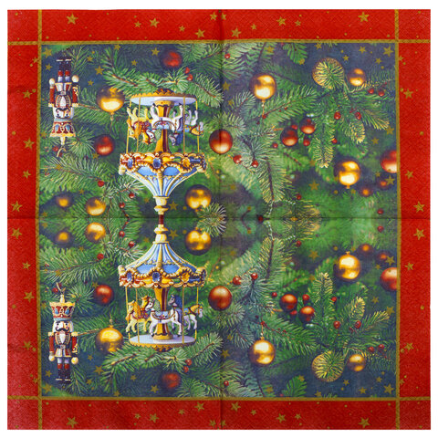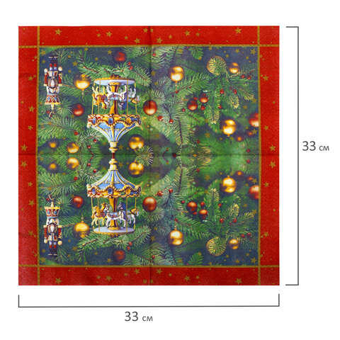 Количество в комплекте: 20 шт. Длина: 33 см Ширина: 33 см Количество слоев: 3 Форма салфетки: квадрат Тиснение: да Серия: Новый год Дизайн: Новогодняя карусель Материал: 100% целлюлоза Цвет: разноцветный