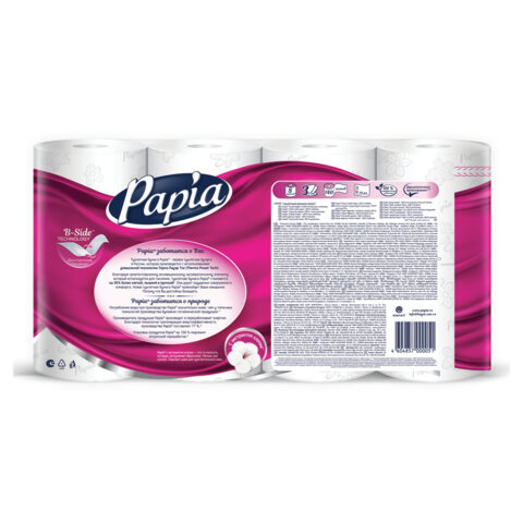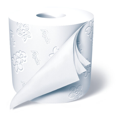 Белая трехслойная бумага PAPIA с экстрактом хлопка необыкновенно мягкая и в то же время прочная. Уникальная технология двустороннего тиснения бумаги обеспечивает лучшую впитываемость и мягкость с обеих сторон.