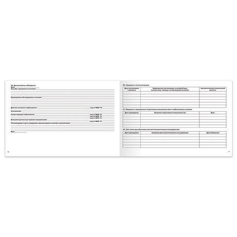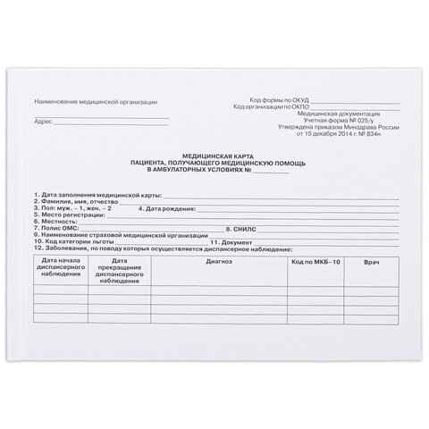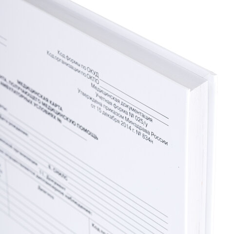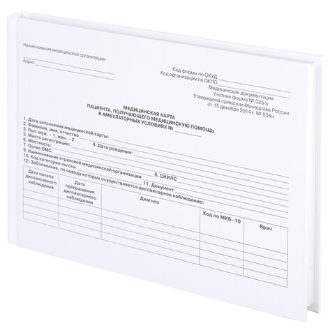 Тип: Медицинская карта для взрослого Дизайн: Белый Государственная форма документа: №025/у Формат: А5 Ориентация: горизонтальная Количество листов: 144 Тип скрепления: книжное Внутренний блок: офсет Материал обложки: твердая обложка с матовой ламинацией. Длина: 218 мм Ширина: 153 мм Индивидуальная упаковка: да