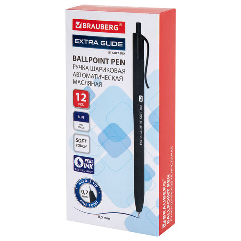 Ручка шариковая масляная автоматическая BRAUBERG "Extra Glide RT SOFT BLK" представлена в трехгранном корпусе черного цвета, дополненном мягким покрытием Soft-Touch, что обеспечивает ее особое комфортное положение в руке при письме. Технология мягкого письма "FEEL INK". Чернила имеют масляную основу и ультрапониженный уровень вязкости, благодаря чему ложатся на бумагу мягко и плавно. Тонкая линия письма толщиной 0,5 мм создается за счет игольчатого наконечника диаметром 0,7 мм. Синий цвет чернил делает ручку универсальной как для учебы, так и для работы.