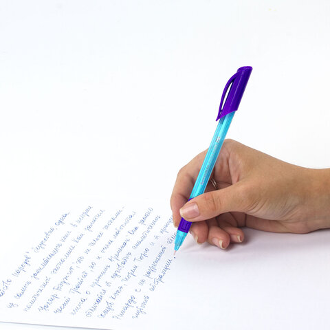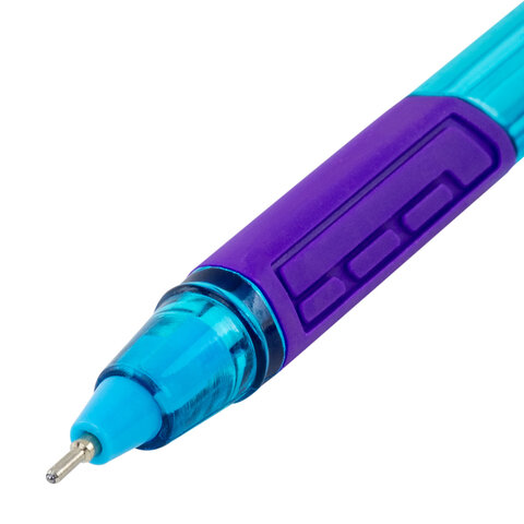 Корпус ручки имеет трехгранную форму и выполнен в ярких оттенках, которые в сочетании с деталями фиолетового цвета создают стильную композицию оттенков. Резиновый держатель в зоне захвата обеспечивает комфортный процесс письма, снижая нагрузку на руку. Технология мягкого письма "FEEL INK". Специальные чернила ультрапониженной вязкости на масляной основе мягко и плавно ложатся на бумагу, а ручка скользит по бумаге без каких-либо усилий. Игольчатый наконечник диаметром 0,7 мм создает тонкую линию письма толщиной 0,5 мм. Цвет чернил – синий.