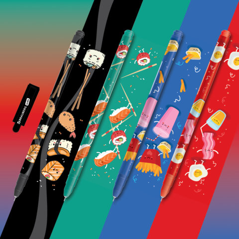 Гелевая ручка представлена в четырех дизайнах с изображением популярных блюд. Благодаря покрытию soft-touch удобно ложится в руке и не скользит при письме. Диаметр пишущего узла 0,5 мм создает тонкую линию толщиной 0,3 мм. Гелевые чернила плавно и мягко ложатся на бумагу, обеспечивая комфортное письмо. Синий цвет чернил делает ручку подходящей для ведения записей во время учебы.
