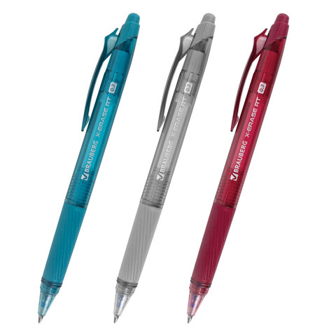 Набор из 3 автоматических гелевых ручек BRAUBERG "X-ERASE RT PASTEL COLOR" позволяет писать синими чернилами линией толщиной 0,5 мм и с пишущим узлом 0,7 мм. Специальные гелевые чернила становятся невидимыми при нагревании до 60 °С и выше. Написанное можно восстановить при температуре ниже -18 °С. В ручку встроен ластик, что обеспечивает возможность многократного стирания и повторного письма. Записи также можно стереть любым другим ластиком. Удобная прорезиненная зона захвата гарантирует комфорт при использовании. В наборе представлены 3 приятных глазу сдержанных элегантных цветов: бордовый, бирюзовый, серый.