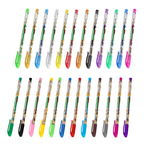 Набор включает 24 ручки с различными эффектами и цветами чернил: 12 ручек с классическими чернилами – необходимая палитра оттенков для различных деталей, 12 ручек с блестками – мерцающий блеск для создания по-настоящему волшебных рисунков и надписей!