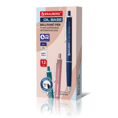 Автоматическая шариковая ручка BRAUBERG "OIL-BASE VINTAGE", элегантная модель доступна в трёх пастельных цветах: темно-синий, бирюзовый и пыльно розовый – идеальные глубокие цвета для тех, кто ценит изящность и индивидуальность. Мягкий soft-touch корпус и прорезиненная рукоять обеспечивают комфортное и надежное держание даже во время длительного письма. Благодаря инновационной масляной технологии чернил, вы получите исключительно плавное и мягкое письмо без усилий. Тонкий игольчатый наконечник диаметром 0,5 мм оставляет изящную линию шириной всего 0,3 мм, позволяя создавать точные и аккуратные записи.
