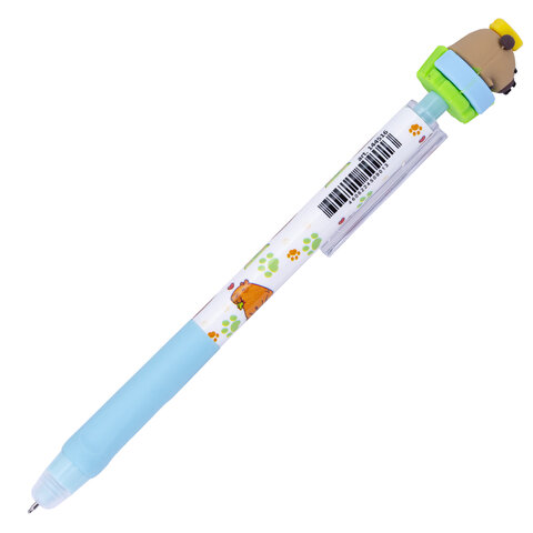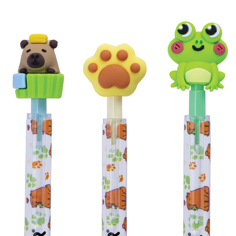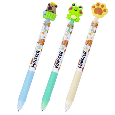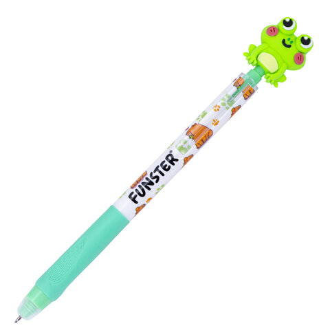 Стираемая гелевая ручка с топпером FUNSTER "CUTE ANIMALS" представлена в трех приятных глазу цветах: светло-зеленый, голубой и светло-желтый. Кнопочный механизм запускается с помощью очаровательных фигурок: милого зеленого лягушонка, яркой желтенькой лапки и забавной капибары.