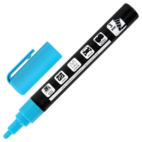 Рисунок получается плотный и яркий. Чернила на водно-меловой основе синего цвета без резкого запаха. Толщина линии письма – от 1 мм до 3 мм, зависит от угла наклона мелового маркера. Круглый корпус выполнен из пластика.