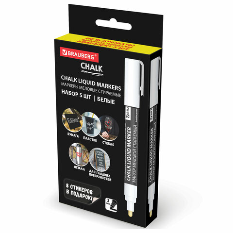 Стираемые меловые маркеры BRAUBERG "CHALK" предназначены для создания рисунков и надписей на гладких и прозрачных невпитывающих поверхностях (например, зеркалах, стекле, меловой пленке). Подходят для школьных занятий, идеальны для детского творчества!